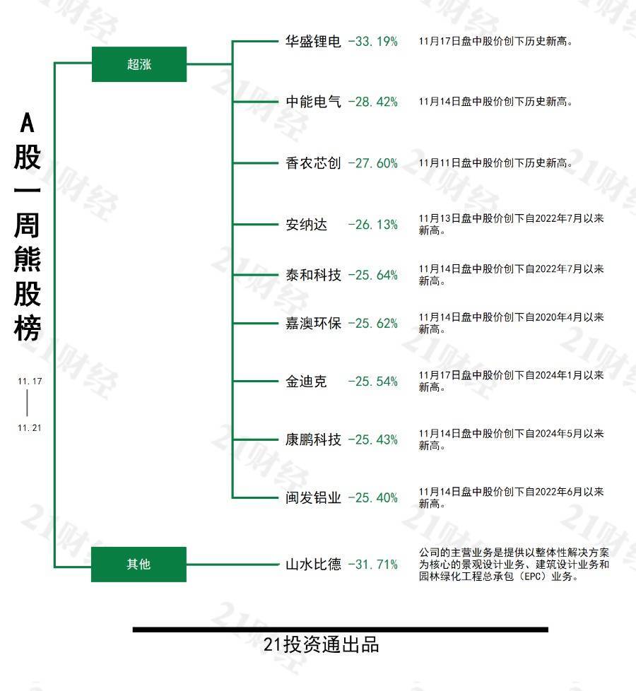 本期十大熊股中,华盛锂电(688353.SH)以33.19%的跌幅成为本期的最熊股。山水比德(300844.SZ)、中能电气(300062.SZ)、香农芯创(300475.SZ)、安纳达(002136.SZ)等股的周跌幅均在26%以上。本期熊股榜十只个股过去一周累计跌幅均超过34%,其中多只个股均在上周突破了阶段性新高。