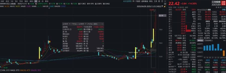 消息面上,近期受地缘局势不确定性影响,国防军工和水产板块表现活跃,江龙船艇的业务同时涉及了军工和水产概念。